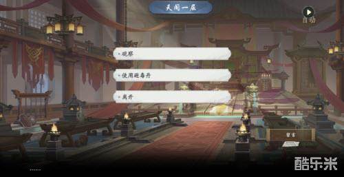 17、进入天阁一层,点击桌面书信接取任务(阅读);点击中央宝座闪光点接取任务:观察和使用避毒丹;