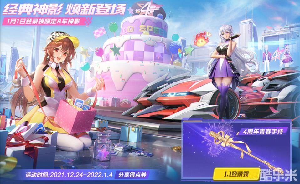 心动神驰,极影无形!1月1日登录直接领取四周年庆专属A车神影,在2022年1月1日-3月20日期间,车手们完成任务收集齐神影勋章并完成所有祝福后,永不回收A车神影。