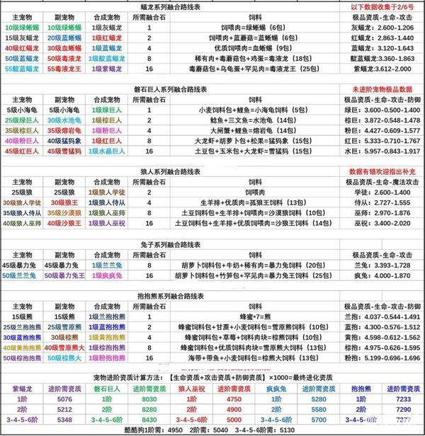 1、融合大全表就如下图所示,大家可以很清楚的看到宠物的所需要的融合石、饲料等。