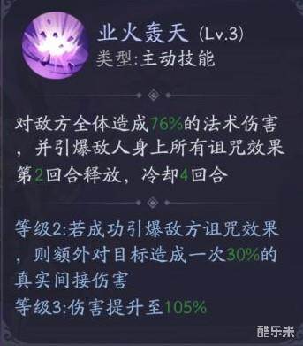 幽冥中最强者当之无愧的是祝融,配合合击技能——山海佳人,伤害爆表,虽然蚩尤伤害更爆表,但是蚩尤有一回合的空档期,祝融容错率更高一点,所以祝融更胜一筹。我们看下祝融的技能: