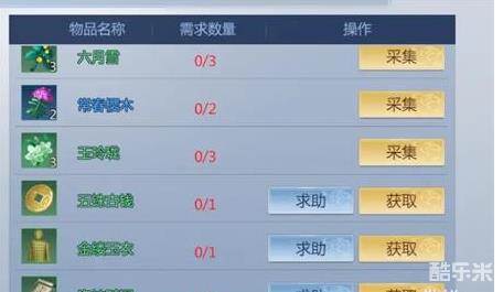 其中采集的物品可以直接野外采集获取,部分道具需要参与日常活动产出,或者家族珍宝阁中使用家族贡献购买。求助的话就是看家族里谁有可以帮你上交,他会失去这个道具/元宝,但是会获得帮贡奖励。