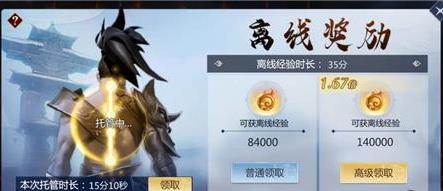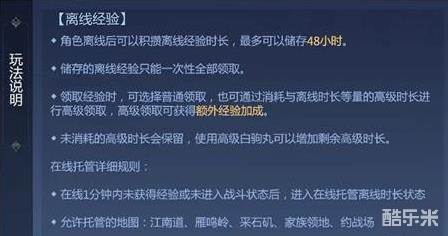 【离线经验】:角色离线后可以积累离线经验时长,然后可以【福利】界面的【离线经验】功能领取积累的经验值。其中分为普通领取和高级领取,高级领取的经验值高于普通领取,但需消耗制定道具。(PS:野外修炼获取的经验值是高于离线托管的)