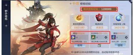 1.上面剩余修炼经验表示了角色今天还能通过野外修炼获取多少十倍经验。