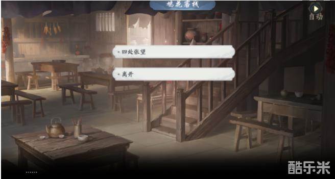 5、进入玄机街捡起右下角闪光点(金币),进入鸠花客栈,捡起桌面面条(资源),点击柜台闪光点接取任务:四处张望。