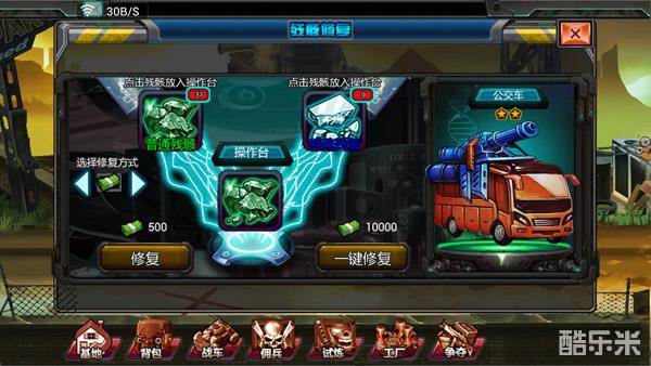 当你有了大量汽车残骸后,就可以通过残骸修复功能来复原出大批战车了!同样,如果血钻足够,可以多使用高级工艺来复原,这样可以有较大几率获得较高星级的战车。