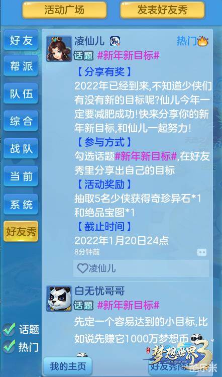 2022年已经到来,梦想大陆祝各位少侠在新的一年也能好运连连。本周游戏更新后,好友秀新增话题功能,官方角色凌仙儿将给各位少侠持续带来热门资讯,还将开启“日常话题”供少侠们分享,更有话题有奖分享活动等各位少侠来参与!除此之外,本周重点内容还有伙伴飞升全服开放,一起来看看本周的更新内容吧!