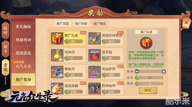 另外,推广系统还新增推广商城分页以及推广列表分页,上仙们可以前往奖励—常规—推广奖励页面查看。