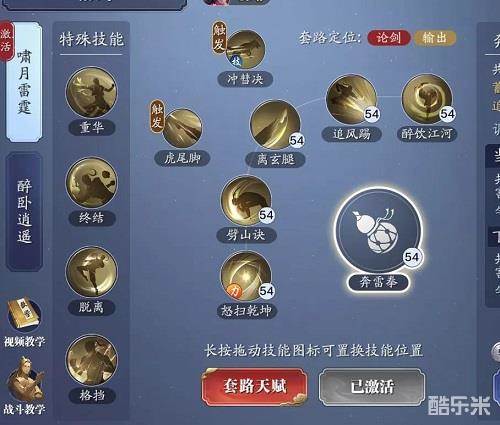 5、醉饮江河直接满力但是不加技巧。技能循环为多用噼山+离玄腿追风踢等技能后摇较短的技能,醉饮江河第一时间翻滚打断后摇怒扫干坤在力没满且无其他技能的时候在使用。