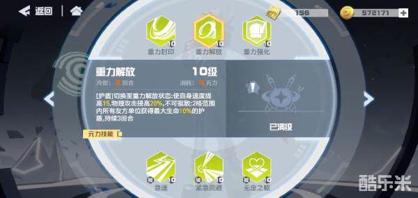 首先是重力释放,消耗4元力,提高自身速度和攻击,给自己和一定距离内友方单位提供护盾。