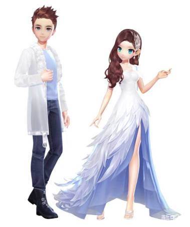 男生身穿黑白配色的休闲套装,由白到黑,如日夜交替,周而复始;女生晚礼服上层层叠叠的羽毛随风飘动,如时光流逝,静谧无声。