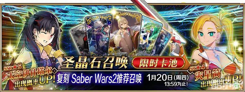 本次的卡池是【复刻 Saber Wars2推荐召唤】,开启时间从1月6日17:00持续到1月20日13:59。