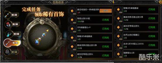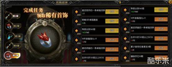 “穿戴5阶卓越套装2件”这个任务相对容易,是对玩家个人实力的要求,当然玩家也可以通过交易行购买装备来完成,不过这就要玩家消耗一定奇迹币了。