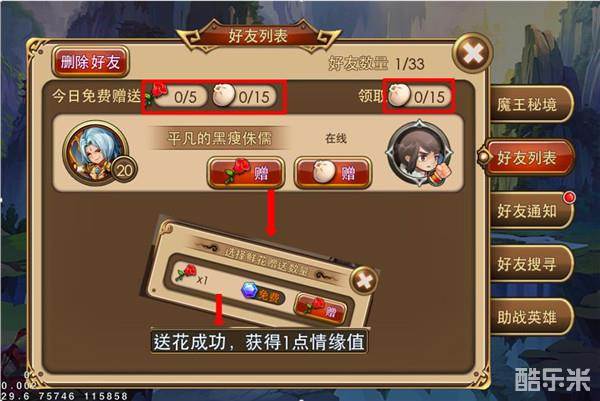 好友列表,显示的是你的所有好友,在线的好友优先显示。对于好友,可以赠送玫瑰花和体力哦,每次送花都能获得情缘值,每天都可以免费赠送5次花,15次体力,别人送给你的体力可以通过邮箱领取。