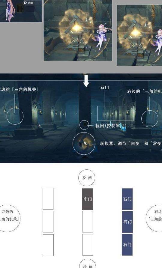 解谜可以先熟悉下机关和环境,这里除了转化器,还有拉闸,石门,牢门,「三角的机关」。