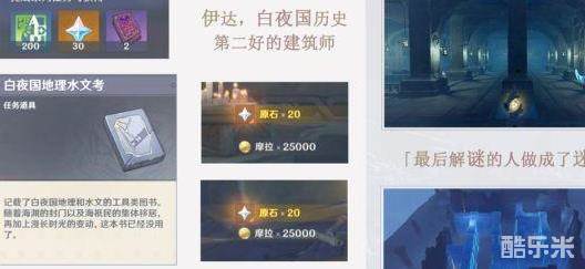 从常夜灵庙的解谜到「伊达的挑战状」任务的完成,整个过程获得任务30原石,宝箱20原石,宝箱20原石,1个成就,《白夜国地理水文考》和其他奖励。