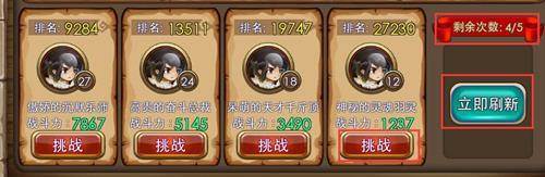 竞技场一次显示4个对手,排名有高有低,你可以根据自己的战斗力选择合适的挑战对象。如果不满意,可以点击右边的立即刷新。可以换4个挑战对象。竞技场每天可以免费挑战5次。当然可以根据vip等级不同,我们每天也可以购买一定的挑战次数。