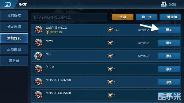 3.添加好友:在添加好友页签,系统会自动推荐一部分玩家,玩家可点击申请按钮进行好友申请,也可以在输入栏中输入玩家标签或名字搜索玩家添加好友;
