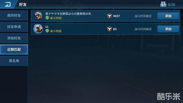 4.近期匹配:近期匹配显示最近对战玩家,碰到高手想再一次切磋吗?在近期匹配里找到他申请好友进行对战吧!