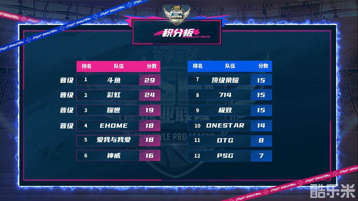 2021《街头篮球》FSPL职业联赛常规赛收官战的比赛在上海长泰广场进行,本周结束后FSPL常规赛全部结束,积分榜前4的战队将晋级最终的FSPL总决赛,最终斗鱼、彩虹、耀世以及Ehome晋级FSPL总决赛,让我们一起来了解下比赛详情!
