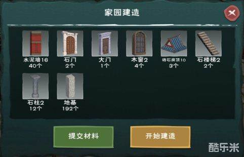 2、开始建造之前会让你确认本次建造使用的材料,点击【提交材料】即可提交。所以建造之前一定要提前先准备好建筑材料哦。