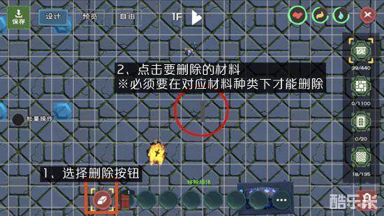 7、如果不小心放错了,也可以通过删除单个材料来进行修改。先选择删除按钮,再点击要删除的材料即可。(注意:必须是要在对应材料分类下才能删除。例如你要删除一片墙,就需要先选中右侧墙体分类,才能删除墙)