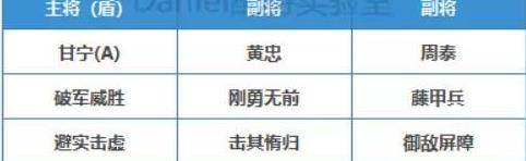 吴藤甲盾,甘宁吴盾,甘宁主将可以提升队友的5%会心几率,以及10%会心伤害,利于黄忠输出。因为这队太过看脸,并且很容易被控,所以藤甲这种硬减伤,就非常适合了。周泰在这里提供增伤,以及藤甲、御敌之外的再一重生存保障。(本来草船是很适合的,但是周泰的分担机制应该会让草船回血变得很鸡肋)