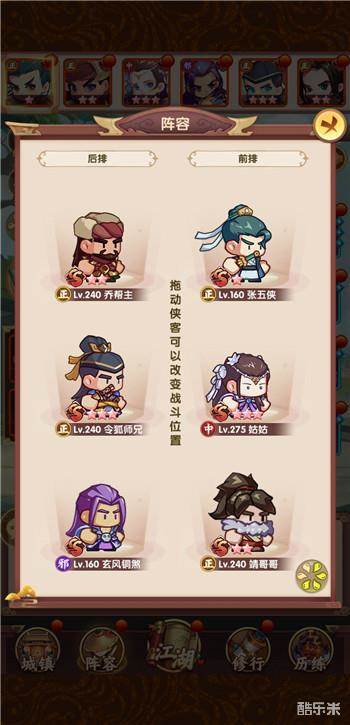 现在来说说这个阵容配速,姑姑一速,郭靖二速,乔峰/张五配三或四速,令狐五速,旋风一定最后,不然一被打就醒了。这个阵容里唯一可以换的是张五,可以换增伤/加属性辅助。武学令狐带玄女或百花,其他都可以带武当,前排怕暴毙也可带峨眉。我阵容中张五速度最慢是因为没有本体卡,所以我给他选了武学峨眉,让他前两轮只给令狐加攻击。旋风五星就可以用,不占用太多资源,当然最好能红二。这个阵容350层之前没有实测过,不过想来应该好爬塔,希望亲自实践过的能补充一下。