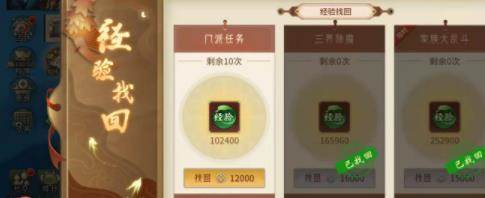 第三种获取途径请点击找回功能,右下角有一个一键找回,玩家可用铜币来得到经验值,也是很划算的,可以快速找回前一天未参加的活动百分之百的经验,第四种途径可前往秘境板块,里面有顺序性的任务,点击开始挑战,结束以后会得到一定的经验值。