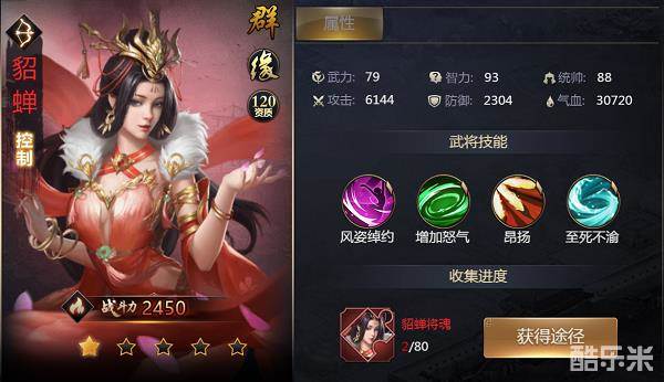 总结一下:貂蝉被动技能和资质技能都很不错,主动技能和缘分技能稍弱,可以给到83分,很棒的武将!