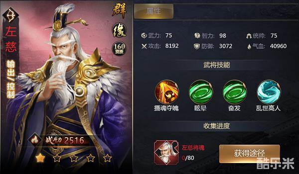 总结一下:左慈的主动技能和资质技能都还不错,缘分技能较为一般,可以给82分,很棒的武将!