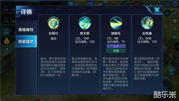 一技能-思无邪:蔡文姬演奏乐曲,短时间内提升移速并为自身和周围的友方英雄回复生命。