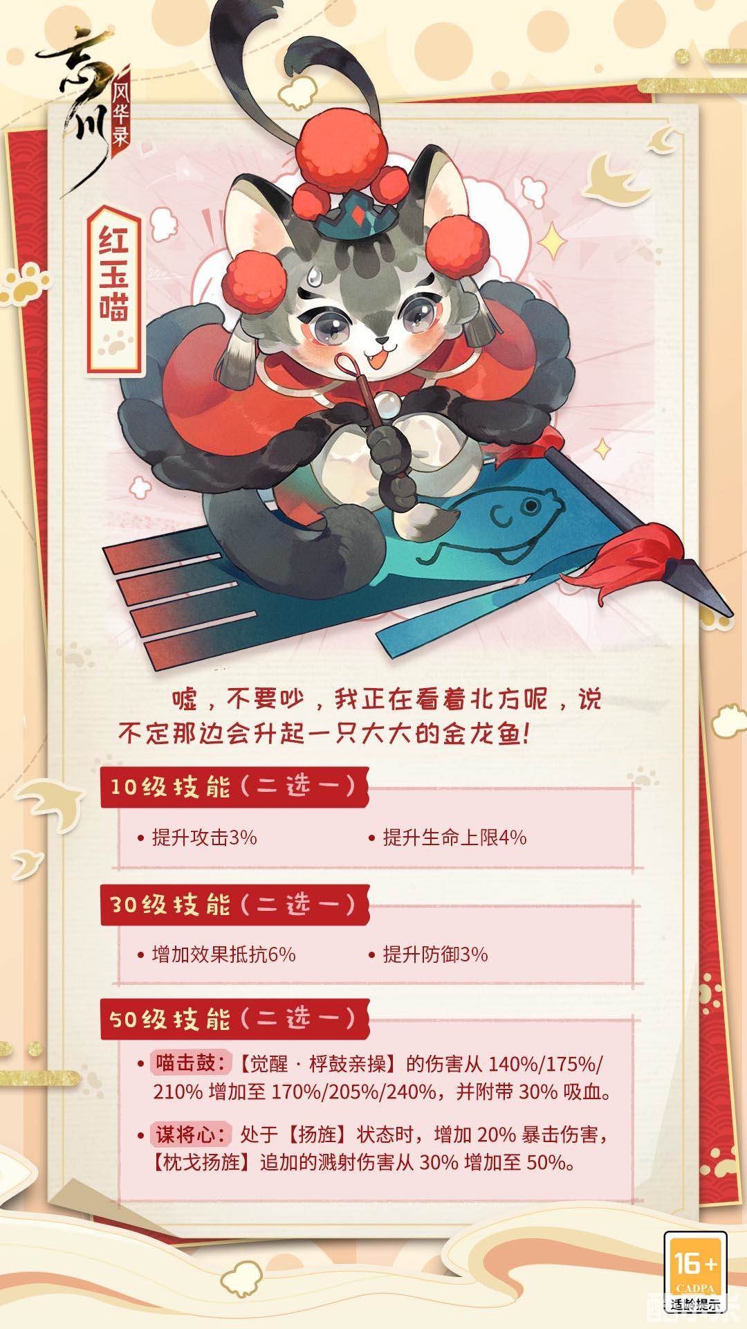 红玉喵等级提升至10级时,可解锁技能:提升攻击3%或提升生命上限4%;等级提升至30级时,可解锁技能:增加效果抵抗6%或提升防御3%:等级提升至50级时,即可解锁技能【喵击鼓】或【谋将心】。