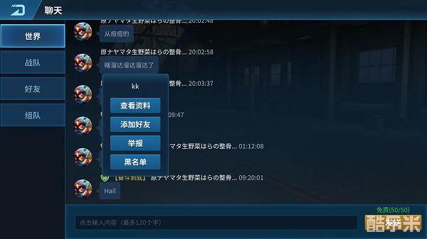 在聊天界面我们可以看到发言玩家的头像,昵称,发言时间,发言信息,如果玩家有加入战队还可以在玩家昵称前看到战队徽章和战队名。玩家可以对发言人进行查看资料、添加好友、举报、添加至黑名单操作,十分方便。