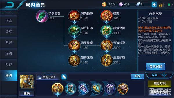 奔狼纹章:鬼谷子作为一个辅助是吃不到多少经济的,而奔狼纹章能够提供一定的经济,使其发育不会太差。且其主动技能能够使全队加速,搭配自身技能特性,能够起到一个非常不错的效果。