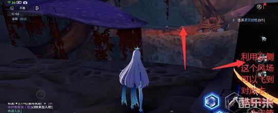 3、然后用右边的风场我们就可以去蘑菇上,接着往上走,然后就可以去最大的蘑菇上,我们看到下面就可以看到一个风场;