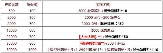 【活动内容】活动期间可通过充值金币获得好运值,积累好运值即可打开宝箱奖励,闪耀称号,全新神器,绝对超值的提升战力资源,尽在特惠好礼。
