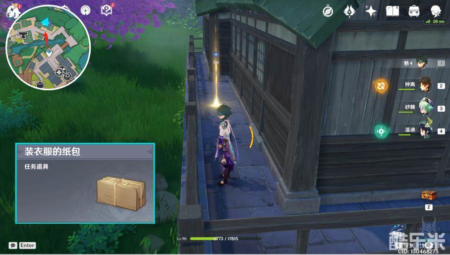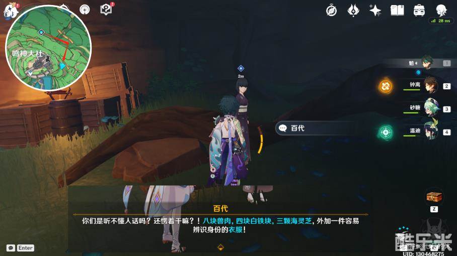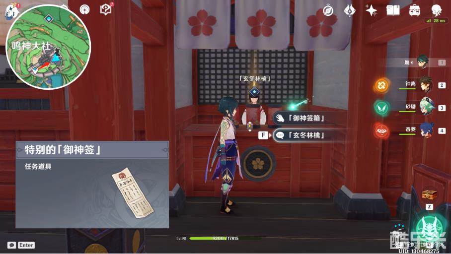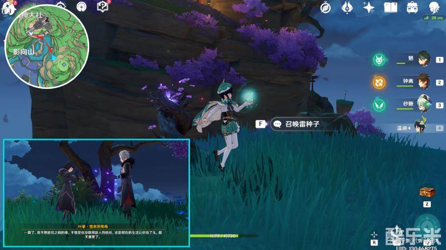2.调整游戏时间到晚上( 21点~23点)等待假玄冬,在鸣神大社传送点旁边这个位置哟呵黄色的任务光柱,就能触发,然后开元素视野跟上假玄冬。