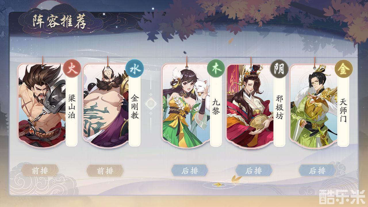 4、当然,如果没有阴系卡,也可以用梁山泊、南宫、金刚等死亡后有额外效果的前排侠客,阵亡后能快速给邪极增伤回内,组成自爆阵容。