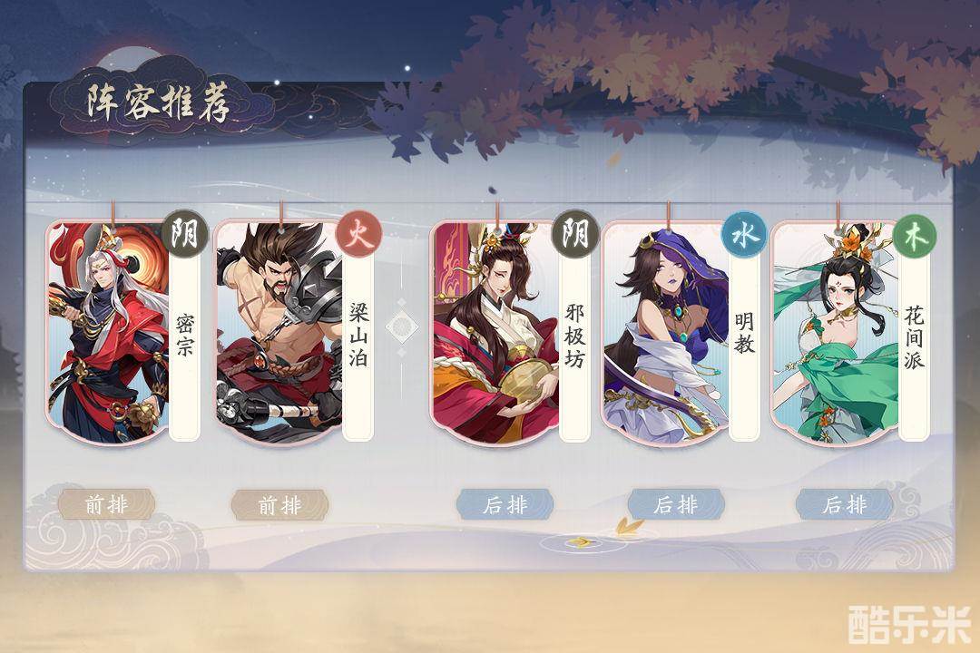 这套阵容非常契合邪极,主打全面进攻。密宗虽然说是辅助侠客,但是由于重生返场的效果,可以先放前排吸收伤害,加速密宗开启绝技,还能瞬间叠满邪极被动,梁山泊同样能吸收大量伤害同时打乱敌方阵型,削减敌方血线,而明教在死后也有额外效果,能够造成范围伤害,强化邪极伤害,这三位侠客死亡后的额外效果都非常契合邪极,而花间派,则能全面提升队伍的进攻能力,加速队伍的启动效率,让队伍的进攻变得非常凌厉。
