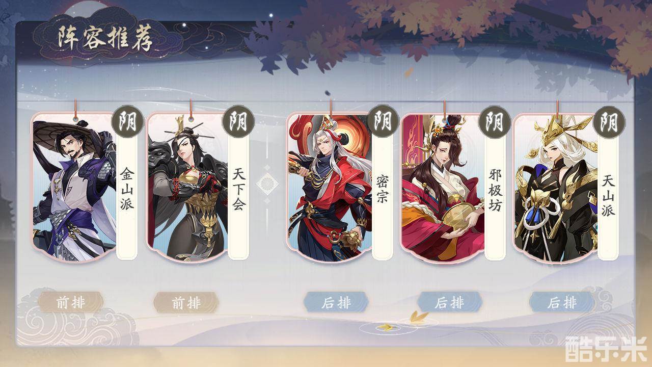 邪极的梦幻阵容!当五名阴属性侠客集结时,能触发强力的阴系羁绊,巨幅提升攻防能力。同时,天下会作为最强力前排,能大幅为队伍吸收伤害吸引火力,而金山作为能攻能守的剑客,在辅助天下会扛住伤害的同时还有不俗的输出,密宗和邪极是绝配,当密宗开场阵亡之后,放完大招后会回场,同时还能给邪极增伤回内!同时密宗能增加队伍进攻能力还能作为副核,天山派则能轻易侵入进敌方阵容,打出高额爆发,全面无短板,就和邪极的能力一样,但要在江湖里凑够这队“五阴之师”,那可谓是难上加难。