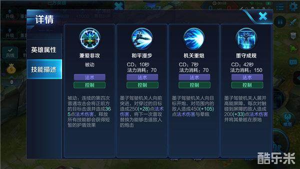 墨子拥有强力控制,而且灵活性不错,就是前期伤害一般,所以要稳住发育到中期掌控节奏,多多练习墨子提高技能的准确性。