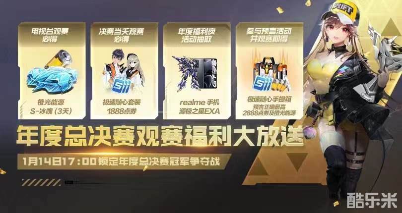 比赛当天前往游戏内电视台观赛必得橙光能源、S-冰魄(3天),还有极速随心套装、1888点券的观赛好礼等待玩家们带走~观赛时参与弹幕互动抽奖,还有机会获得全T全A账号、realme手机、源极之星EXA等大奖!