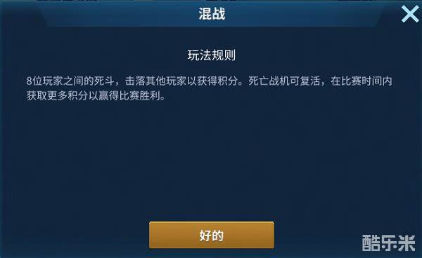功能解锁等级1级,玩家从主界面--升空作战--活动模式--8人混战--点击开始,即可进入该模式。玩家1级就可以参与,该模式下8名玩家随机匹配,混战,每人有1架飞机,无限复活。