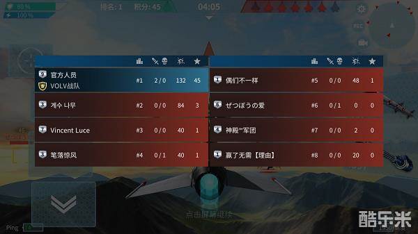 我们在游戏战斗界面可以看到实时的积分排名,以及游戏时间倒计时。点开详细统计界面,还能看到所有玩家的排名、击杀数、死亡数、伤害点数、积分。我们每次击落、被击落都能看到积分的变化。