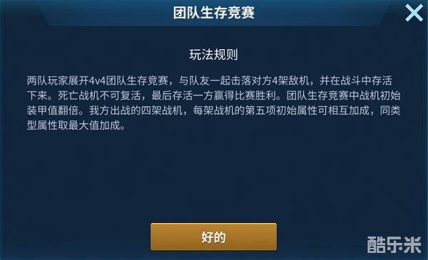 功能解锁等级12级,玩家从主界面--升空作战--活动模式--4v4团队生存竞赛--点击开始,即可进入该模式。该模式下8名玩家随机匹配,分成两方4V4,每人有1架飞机,不可复活。