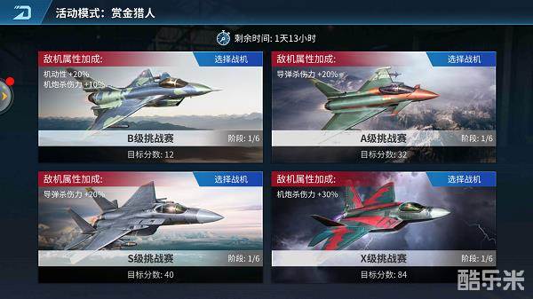 单人活动模式内可以看到不同级别的挑战赛均会显示一个指标,敌机属性加成。这是为了增加游戏刺激性,给敌机增加的一个友善的BUFF。敌机属性加成有很多种,每次活动开启后,每级挑战赛会随机选择1种敌机加成(有的包含两种属性加成),本级6个阶段都用此加成,本轮活动加成保持不变。