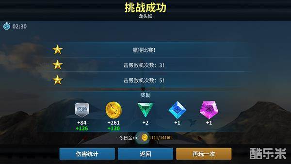 对决赛游戏时间限时2分30秒,玩家使用一架飞机,对面一架敌机,可以无限复活。玩家击落敌机则取得比分,被击落则敌机取得比分。战斗界面显示当前双方的比分、击杀和死亡数。同时在战斗界面显示游戏倒计时,倒计时为0时游戏结束,结算比分,双方比分高者获胜。首次达成星级目标还将获得额外奖励。重复通关可获得经验、金币。