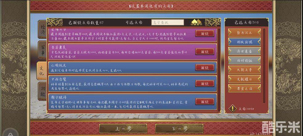 天策传奇懒人玩法,核心利用汉宣帝刘病已的皆为汉土,加上汉献帝的济世悬壶,每座州府可以只建几千民兵,开始刷皇威和民心,保证民心和治安90以上(建议用加民心和治安的天命,携带加皇威的天命或者多选增加皇威上限的天命),我用大新天子纯粹是懒,因为地图没有日本,可以直接吃福利。因为debuff限制军队移动,用戈戟曜日克服。第一年金卡可以开始就用百家争鸣,选儒家,臣子孔子,老子,智能建设和清理闲官,一回合稳定加20,加上迁都和大赦,一年可以增加200皇威左右。后面开五行,选加治安民心都行,科举制度,其他单回合金卡想用就用,紫卡用内阁制其余随意。然后用特奏名和八股取士,用兼爱非攻,过几个月就有州府归顺,在归顺的州府上驻扎民兵,兼爱非攻过了,有势力攻打就撤退,需要做的是归顺的高野心州府总兵进行更换,大概七八年的时候就有70~90州府,可以不建建筑,经济上负担很小,很难崩盘。十几年应该可以让所有州府归顺。
