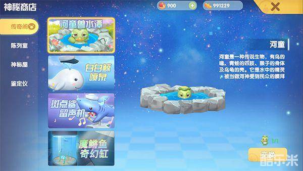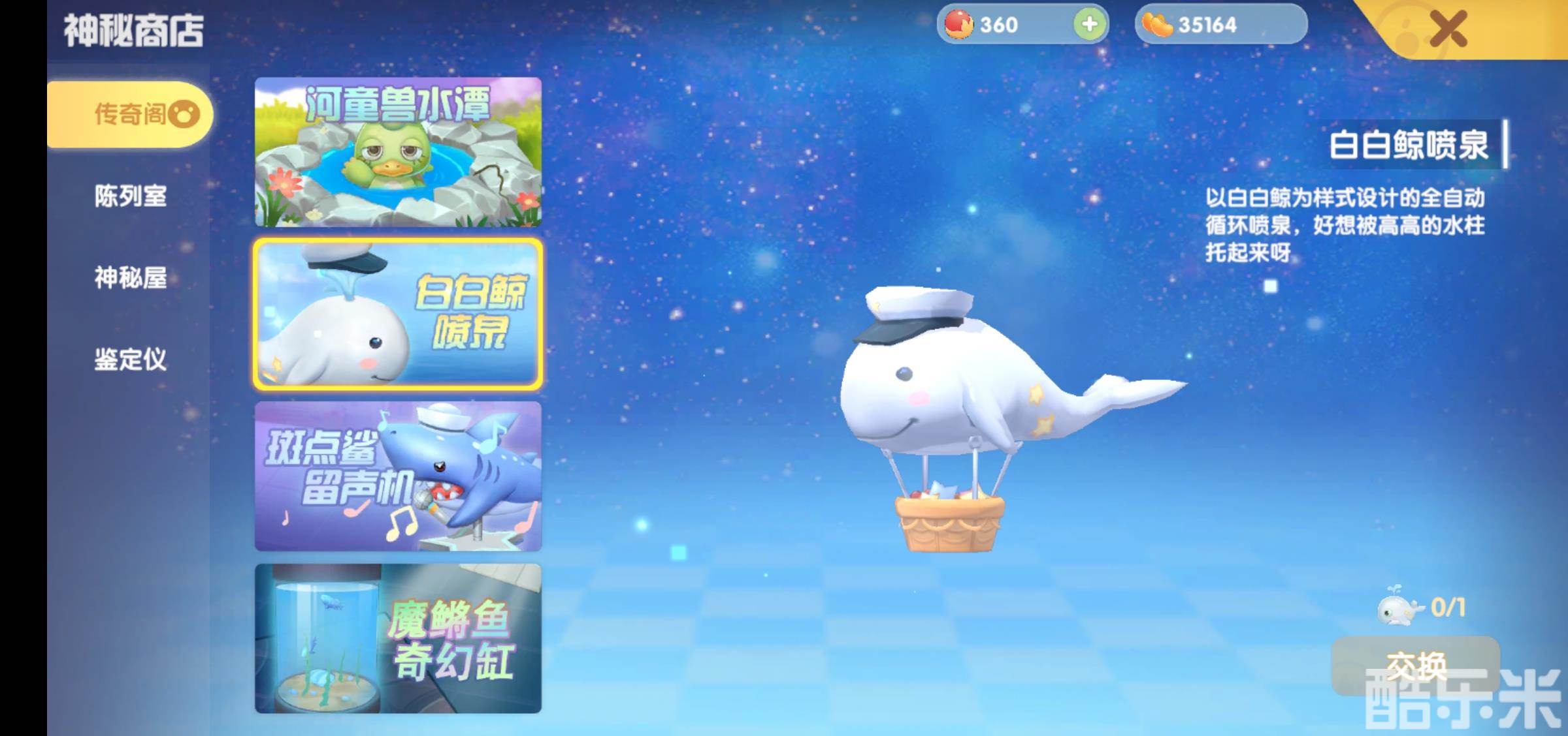 传奇阁目前有四样商品,分别是河童兽水潭,白白鲸喷泉,斑点鲨留声机和魔鳉鱼奇幻缸。这四样都是可以交互的家具,要是全部集齐的话感觉可以装点出一个小型水族馆呢!