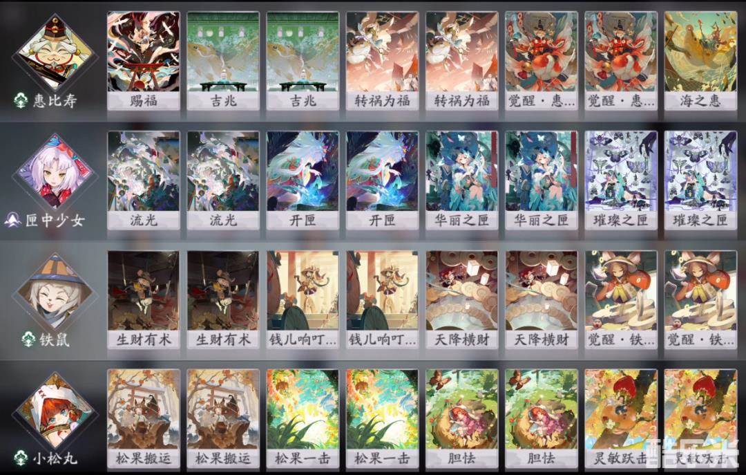 2.惠比寿的基础能力可以对其余式神提供身材属性的加持,使其余式神的形态牌更强力。觉醒·惠比寿在这套卡组中是一张核心卡,昂扬效果和璀璨之匣、觉醒·铁鼠、胆怯都能有不错的配合。